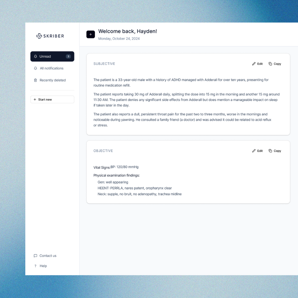 SKRIBER uses advanced AI to transcribe medical conversations into accurate, structured notes. You simply speak during patient interactions, and SKRIBER captures the details in real time, transforming them into complete medical documentation by the end of your appointment. It’s like having an AI-powered assistant that takes notes for you.